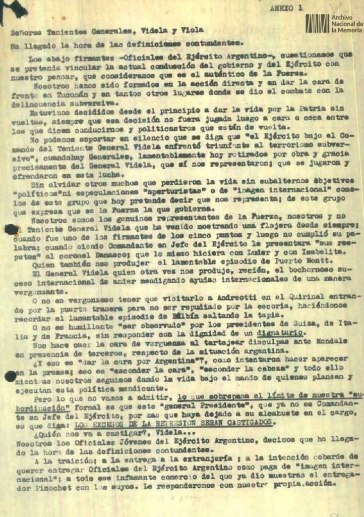 Esto encendió los ánimos entre los comandantes de Cuerpo o los jefes de Zona de la dictadura, quienes creían que con esa tesis Videla estaba olvidando a los “mártires de la lucha contra la subversión”. Los subordinados también salieron a denunciar al dictador por considerarlo víctima de la “flojera”. En una nota enviada a Videla y a Roberto Viola, jóvenes oficiales de Ejército decían: “Lo que sobrepasa el límite de nuestra ‘subordinación’ formal es este ‘general Presidente’, que ya no es comandante en jefe del Ejército por más que haya dejado a su alcahuete en el cargo, es el que dijo: ‘Los excesos de la represión’ serán castigados. ¿Quién nos va a castigar? Videla”.