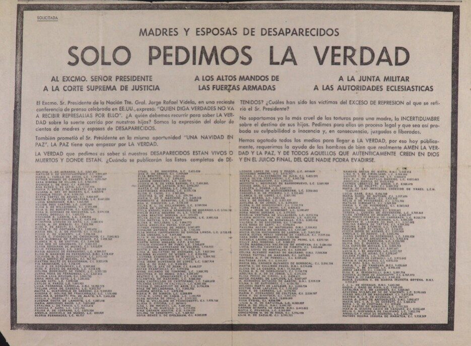 El texto salió publicado el 5 de octubre de 1977. “¿Cuáles han sido las víctimas del EXCESO DE REPRESIÓN al que se refirió el Sr. Presidente? No soportamos la más cruel de las torturas para una madre, la INCERTIDUMBRE sobre el destino de sus hijos. Pedimos para ellos un proceso legal y que sea así probada su culpabilidad o inocencia y en consecuencia, juzgados o liberados”, reclamaban.