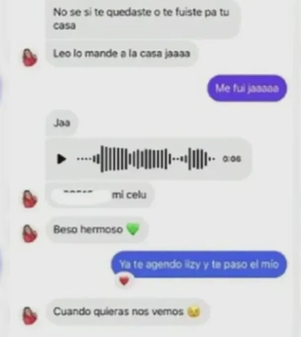 Él responde: “Me fui jaaa”. Luego, ella le envía un audio de seis segundos, le pasa su número de teléfono y acompaña con un mensaje que dice: “Beso hermoso”, junto con un emoji de corazón verde. Bisio contesta: “Ya te agendo Lizy y te paso el mío”, a lo que ella remata: “Cuando quieras nos…”