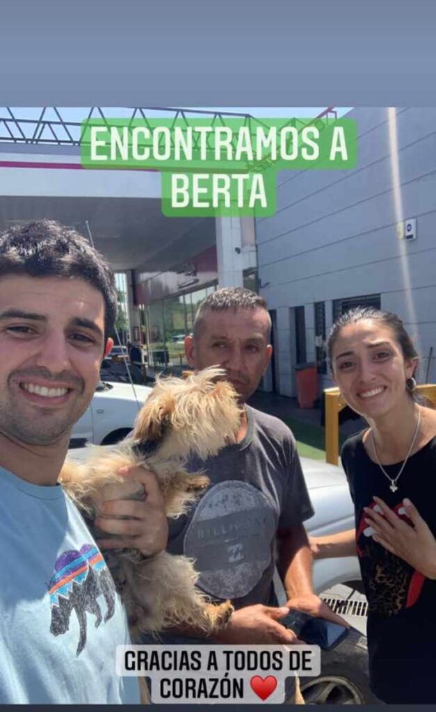 Alejandra sumó a lo vivenciado en este feliz 16 de febrero, que el señor se negó a brindar una dirección y quedaron en verse en una estación de servicio. Donde su marido, Alejandro, asistió y recuperó a Berta luego de dar la correspondiente recompensa al hombre.