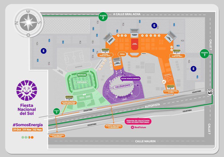 - La puerta 3, 4, 5 y 6 están ubicadas sobre Ruta 40, a metros se ubica la boletería A y se puede ingresar de manera directa al Estadio para disfrutar los recitales, donde estarán los artistas nacionales. La boletería B vincula de manera directa con el acceso peatonal a la feria.