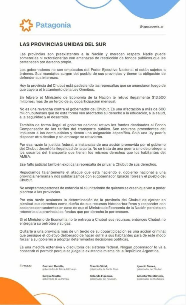 En un documento firmado por los gobernadores Gustavo Melella (Tierra del Fuego), Claudio Vidal (Santa Cruz), Ignacio Torres (Chubut), Sergio Ziliotto (La Pampa), Rolando Figueroa (Neuquén) y Alberto Weretilneck (Río Negro) recuerdan que «las provincias son preexistentes a la Nación y merecen respeto. Nadie puede someterlas ni extorsionarlas con amenazas de restricción de fondos públicos que les pertenecen por derecho propio».