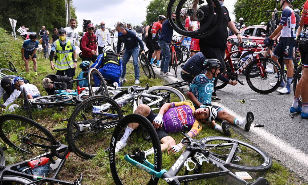 Una aficionada distraída que posaba con un letrero al borde de la carretera durante la primera etapa del Tour de Francia 2021 desencadenó una caída masiva de ciclistas que algún periodista ya ha denominado como «el peor choque» de la carrera más importante del mundo.