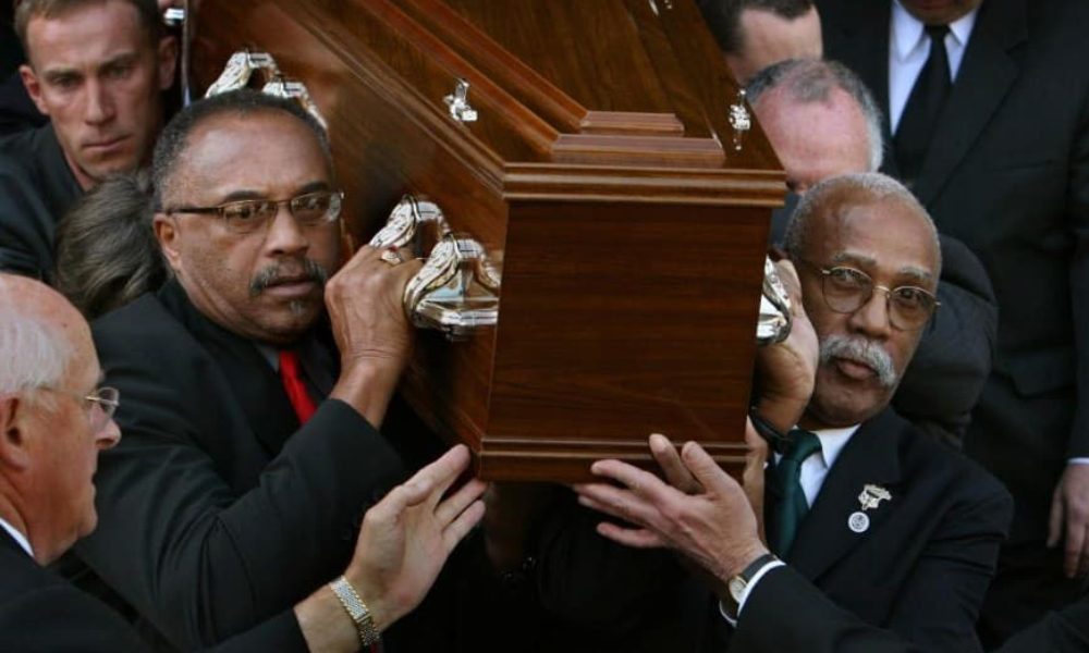 Dos hombres negros y canosos, con anteojos, llevan un sarcófago. Sus hombros sostienen la madera y sus manos se aferran a unas agarraderas de color plateadas, exhibiendo aún más el contraste. Plata y betún. Aparentes antítesis cromáticas de un imaginario colonial y racista. Los dos hombres afrodescendientes han viajado desde Estados Unidos hasta Australia, lugar donde se le rinden homenajes al fallecido.