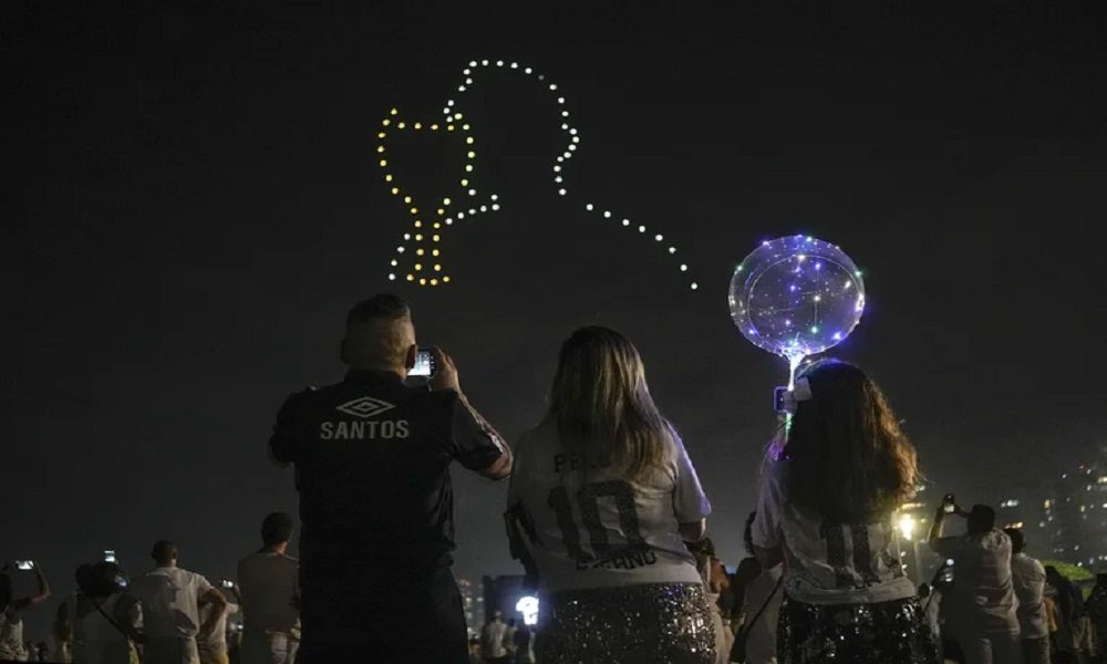 Varias de éstas naves sin tripulación se unieron en el aire para formar diversas siluetas que representaron la vida del astro brasileño. Pelé besando la Copa del Mundo, la cantidad de goles y su tradicional firma junto a un corazón fueron algunas de las imágenes que se vieron en la oscuridad.