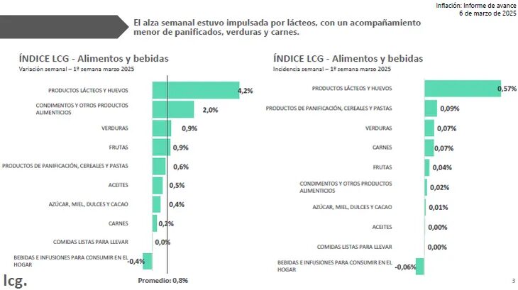 La inflación de alimentos de la primera semana de marzo pegó un salto del 0,8% respecto de los siete días previos, de acuerdo con las estimaciones de la consultora Labour, Capital & Grouth (LCG).