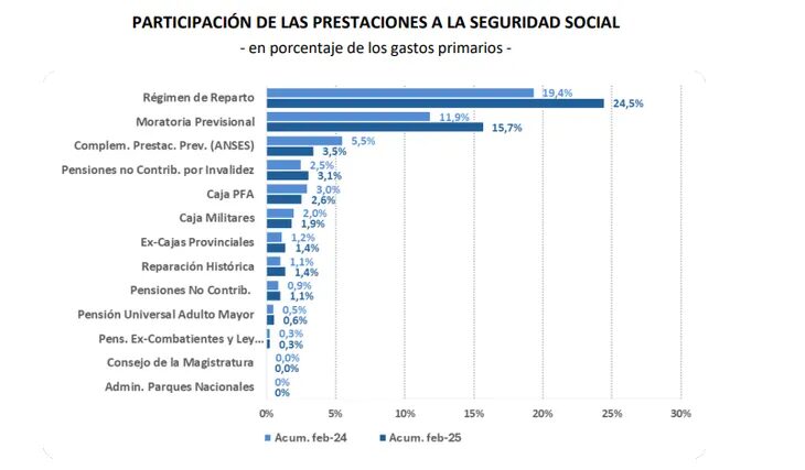 De acuerdo con datos de la Asociación Argentina del Presupuesto y las Finanzas Públicas (ASAP) las erogaciones en moratorias previsionales del primer bimestre de este año representaron el 15,7% del total del gasto social, mientras que el año pasado eran el 11,9%. En tanto, el impacto del sistema de reparto tradicional creció 5,1 puntos sobre el total de las prestaciones sociales, al pasar durante el mismo período del 19,4% al 24,5%.