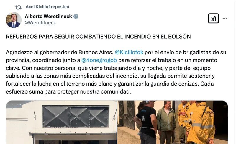 “Su llegada permite sostener y fortalecer la lucha en el terreno más plano y garantizar la guardia de cenizas”, escribió el mandatario del sur en sus redes sociales. “Con nuestro personal que viene trabajando día y noche, y parte del equipo subiendo a las zonas más complicadas del incendio, su llegada permite sostener y fortalecer la lucha en el terreno más plano y garantizar la guardia de cenizas. Cada esfuerzo suma para proteger nuestra comunidad”, afirmó. En los últimos 4 años, el gobierno bonaerense ayudó en siete oportunidades a diferentes provincias de la Argentina por los incendios.