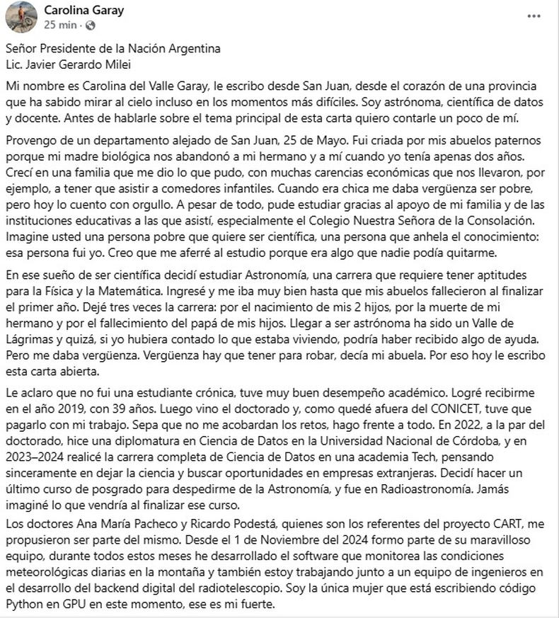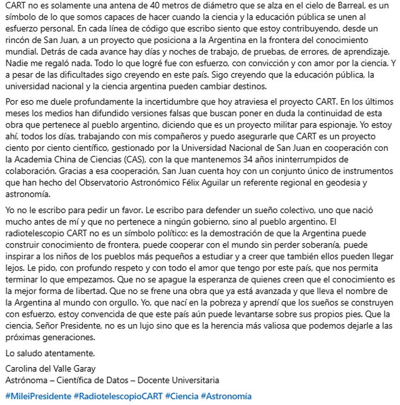 En medio de la polémica por la decisión del Gobierno nacional de discontinuar el proyecto del Radiotelescopio CART, una astrónoma sanjuanina decidió alzar la voz. Conmovida y contundente, Carolina del Valle Garay, oriunda de 25 de Mayo, publicó una carta abierta dirigida al presidente Javier Milei, en la que defendió el valor de la ciencia argentina y relató su propia historia de vida. La de una mujer que, desde la pobreza, llegó a formar parte de uno de los proyectos científicos más ambiciosos del país.