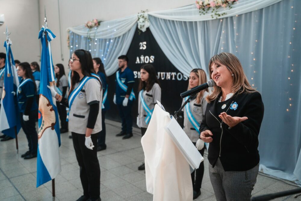 Seguidamente la directora Ivana Royón, tras describir el esfuerzo con el que se consiguió la escuela y el edificio propio, con el trabajo de docentes, padres y alumnos expresando: ”Desde sus inicios la escuela se fue perfilando como una sólida institución en la formación de jóvenes que obligó a la creación de más cursos del ciclo Orientado y una nueva modalidad en Artes Visuales. Cumplimos un cuarto de siglo de historia por el sueño y trabajo de todos. Lo más valioso de esta institución son nuestros alumnos los de hoy y los que vendrán. Sumado el capital humano de: docentes, personal administrativo, Gabinetes, bibliotecarios, de mantenimiento y las DAI porque somos una escuela inclusiva. Gracias a todos y a seguir brindando herramientas para la vida a nuestros alumnos”
