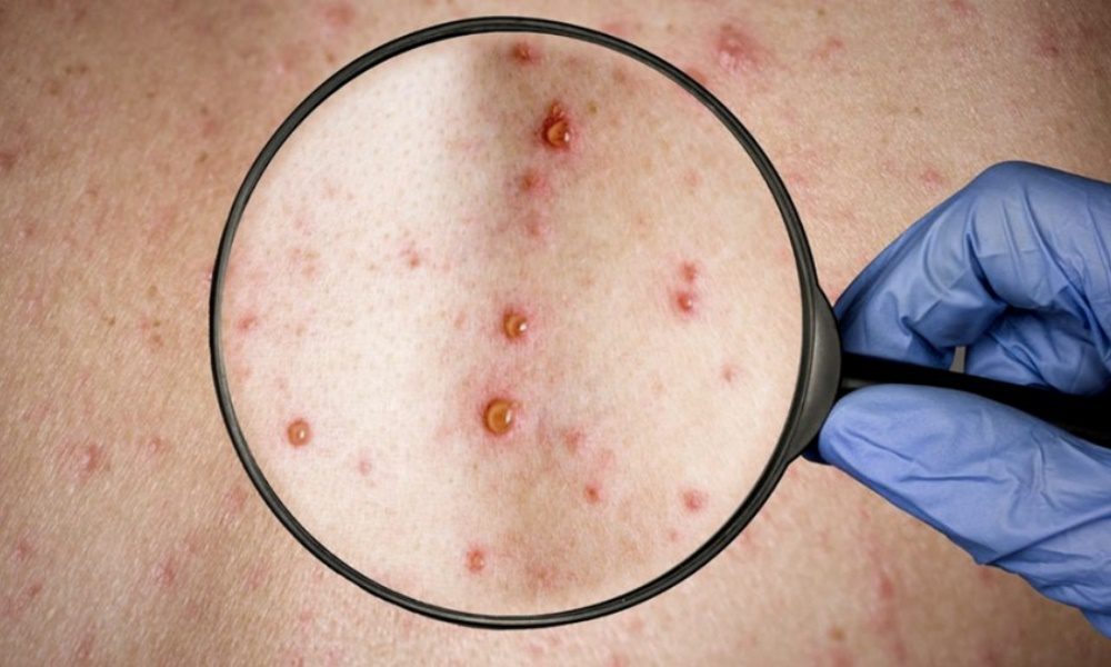Luego aparecen erupciones (en la cara, las palmas de las manos, las plantas de los pies), lesiones, pústulas y finalmente costras.