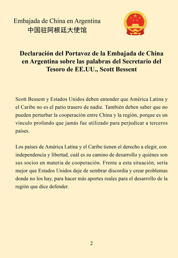 El país asiático enfatizó que «Scott Bessent y Estados Unidos deben entender que América Latina y el Caribe no es el patio trasero de nadie», al tiempo que desde el país gobernado por Donald Trump “no pueden perturbar la cooperación entre China y la región, porque es un vínculo profundo que jamás fue utilizado para perjudicar a terceros países».