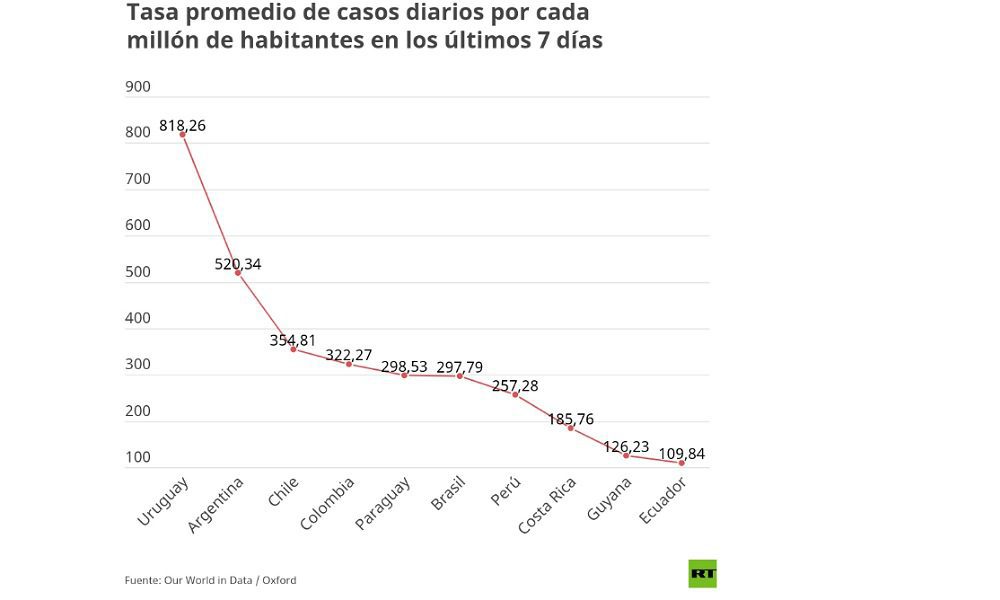 El país más golpeado en la última semana, en relación con su población (3,47 millones de habitantes), es Uruguay. Según el sitio web Our World in Data, de la Universidad de Oxford, que publica datos sobre el avance de la pandemia en el mundo, en los últimos siete días —del 13 al 20 de abril— esta nación suramericana registró una tasa de 818,26 casos positivos de coronavirus al día por cada millón de habitantes.