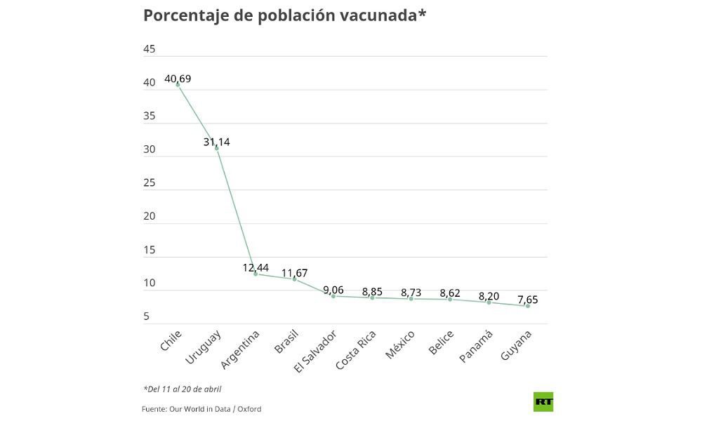 Uruguay, por su parte, ha vacunado a 31,14 % de su población hasta martes 20 de abril; mientras en Argentina el porcentaje de vacunados es de 12,44.