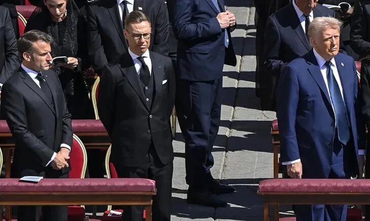 Trump, acompañado por la primera dama, Melania, se situó en el comienzo de uno de los bancos de la primera fila y en el banco inmediato, separado por un pasillo, estaba el presidente de Finlandia, Alexander Stubb, y a su lado, Macron.