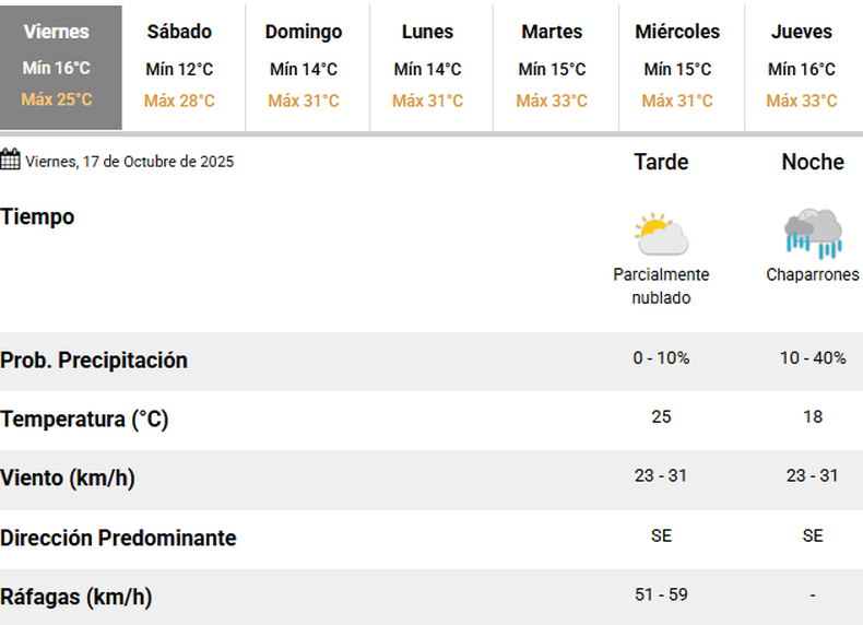 Para el fin de semana, el SMN informó que el sábado estaría parcial a mayormente nublado. La máxima sería de 28° y la mínima de 12°.