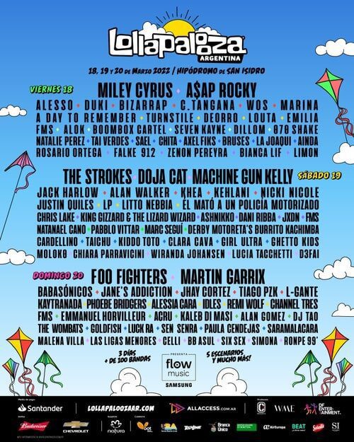 Después de tres años de su última edición, vuelve el Lollapalooza a Argentina. Los próximos 18, 19 y 20 de marzo de 2022 en el Hipódromo de San Isidro se celebrará el festival que tiene como bandas principales a Foo Fighters, Miley Cyrus, Doja Cat, A$AP Rocky y The Strokes.