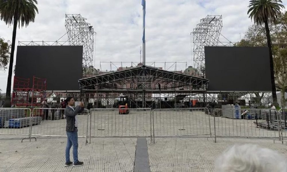 El escenario sobre Plaza de Mayo ya está listo. Tiene casi 50 metros de ancho. Mirándolo desde la pirámide de la plaza, visualmente tapa a la Casa Rosada. Hasta la mañana de este miércoles, el tránsito sobre calle Balcarce no había sido cortado. Detrás del escenario, de espalda a Casa Rosada, se están montando los espacios VIP para los invitados especiales.