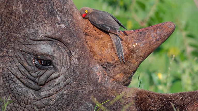 Amigos peculiares: Se relacionan con los pájaros: El picabuey, un ave pequeña con la que comparte el hábitat, se sienta en el lomo del rinoceronte y se come los insectos que se encuentran en su piel. Además, cuando acecha algo extraño, el pájaro grita y advierte al rinoceronte. Así entablan una sociedad perfecta.