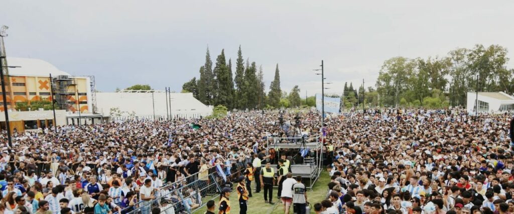 Miles de personas llegaron al Parque de Mayo para ser parte de los festejos en San Juan por la obtención de la Copa del Mundo en Qatar, con la principal premisa de poder apreciar desde cerca el trofeo traído por el sanjuanino Claudio «Chiqui» Tapia y ver al jugador Exequiel Palacios.