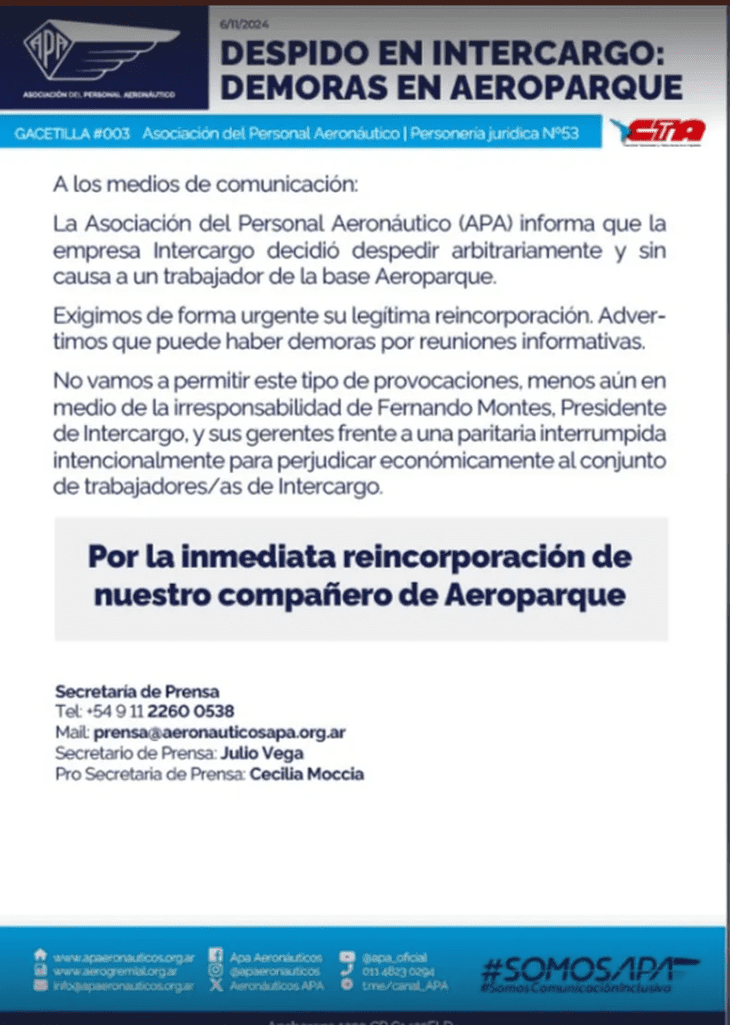 La medida de fuerza, llevada a cabo el miércoles al mediodía, provocó demoras y cancelaciones de vuelos. Según detallaron desde el gremio de aeronáuticos, la decisión de realizar asambleas informativas se tomó luego de que la empresa decidiera despedir de manera «arbitraria» a uno de sus empleados.