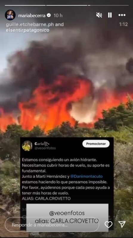 Luego, María Becerra invitó a ingresar a su cuenta oficial de Instagram donde se encuentra información importante para aquellos que quieran donar: «Para que puedan ir aviones hidrantes a seguir apagando el fuego, que es lo que más importa en estos momentos, porque muchas familias perdieron sus casas, porque hay miles de hectáreas quemadas, porque hay gente que murió, porque hay animales que están muriendo y porque a nuestra Patagonia le están haciendo mucho daño«.