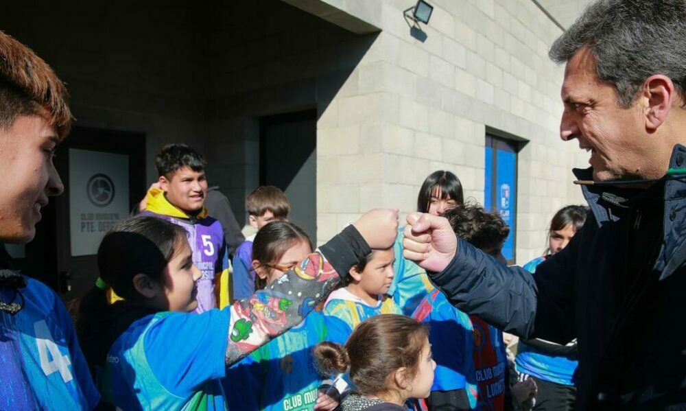 «Defendamos la Argentina del trabajo para poder pelear por una mejor puja distributiva», pidió Massa frente a los vecinos de la localidad de Presidente Derqui, en el acto de inauguración del Club Municipal Presidente Derqui «Lionel Messi», en Pilar, junto al ministro de Transporte bonaerense, Jorge D’Onofrio, y el intendente local, Federico Achával.