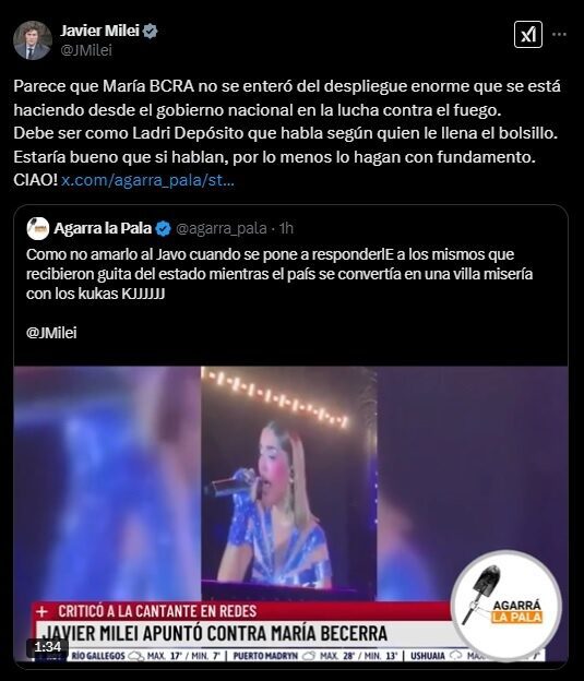 «Parece que María BCRA no se enteró del despliegue enorme que se está haciendo desde el gobierno nacional en la lucha contra el fuego. Debe ser como Ladri Depósito que habla según quien le llena el bolsillo. Estaría bueno que si hablan, por lo menos lo hagan con fundamento. CIAO!», publicó Milei desde su cuenta de X.