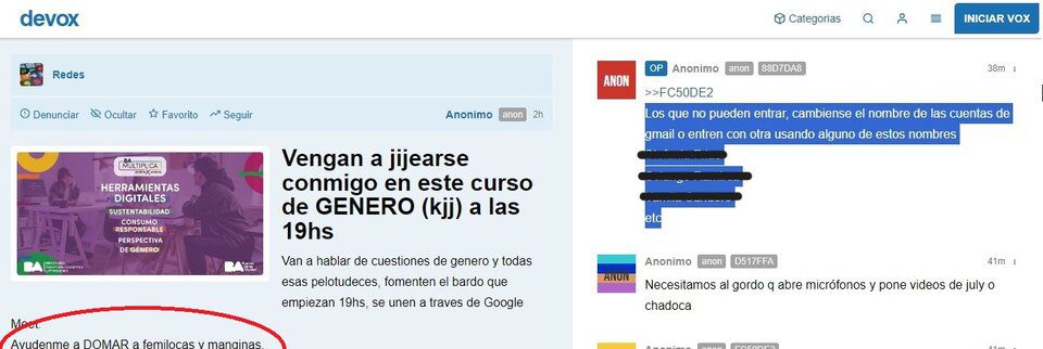 La agresión se orquestó mediante la plataforma Devox, que proporciona a los usuarios chatear en el anonimato. “Vengan a jijearse -burlarse- conmigo en este curso de GENERO (kjj) a las 19hs”, era la invitación que publicó un anónimo compartiendo el link de la charla virtual, donde además indicaba: “Van a hablar de cuestiones de género y todas esas pelotudeces, fomenten el bardo. Ayudenme a DOMAR a femilocas y manginas -varones involucrados en lo relacionado al género-”.