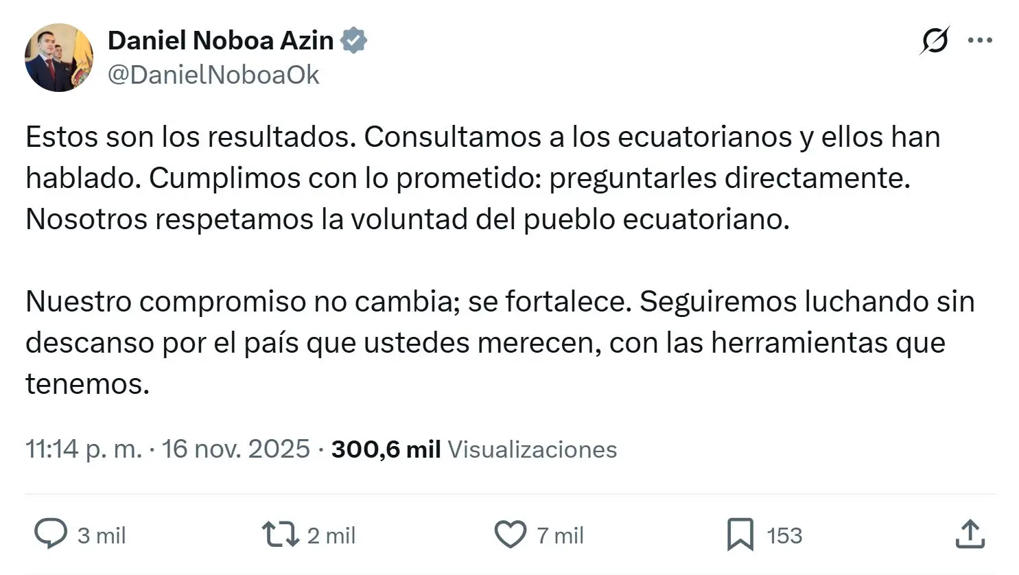 Aunque se cargó la campaña al hombro, incluso pidió licencia de sus funciones presidenciales para dedicarse a tiempo completo a promocionar el SÍ, una vez que se conocieron los resultados Noboa se manifestó con un escueto tuit. Para tranquilidad de la oposición, fue claro su reconocimiento de los resultados aunque redobló la apuesta al sostener que va a insistir con el camino trazado pero con otras «herramientas». La misma baja que repitieron al unísono el presidente y la vicepresidenta de la Asamblea junto a otra legisladora en la breve conferencia que dieron ante la prensa.