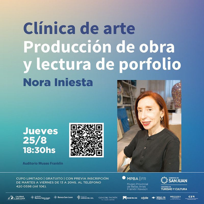 En el marco de su programa de formación y capacitación, el Museo Franklin Rawson presenta a Nora Iniesta, destacada artista nacional que brindará por primera vez en la provincia una Clínica de Arte sobre producción de obra y lectura de portfolio, destinada a artistas visuales, estudiantes y egresados de carreras afines. La misma tendrá como objetivo aportar herramientas que contribuyan a la formación profesional.