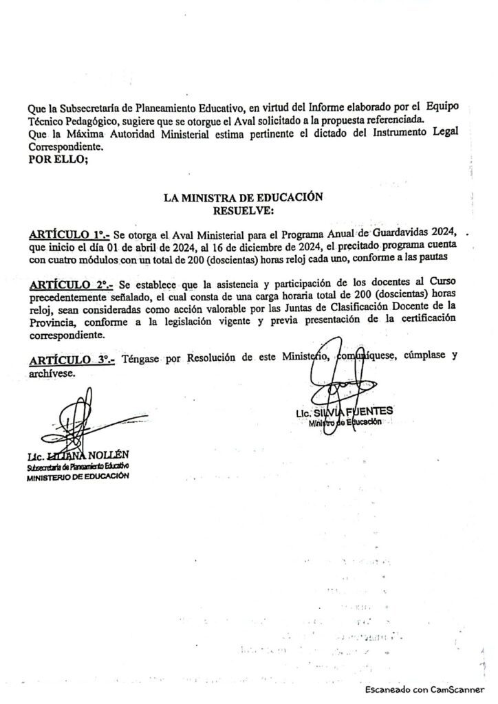 Gran noticia para el Curso de Guardavidas 2024, que iniciado el 1º de abril y con fecha de finalización el 16 de diciembre del 2024, ya cuenta con aval ministerial, mediante Resolución Nº 05216 firmada por la ministra de Educación, Silvia Fuentes.