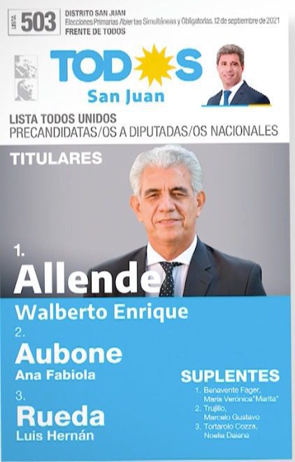 - Frente de Todos: es el espacio oficialista, liderado por el gobernador de la provincia Sergio Uñac. Los tres precandidatos son: el actual diputado nacional Walberto Allende (del Partido Justicialista), quien se jugará la posibilidad de un segundo periodo en la Cámara de Diputados de la Nación; la minsitra de Gobierno Fabiola Aubone (del Partido Justicialista), quien dijo que no renunciará a su puesto como en el ejecutivo provincial mientras dure la campaña; y finalmente el subsecretario de Gobernación y presidente del Partido Bloquista Luis Rueda, quien afirmó que esta es una posibilidad para defender el proyecto y que los dirigentes de su partido se den a conocer, con miras a las ejecutivas del 2023. La lista se ha dado a llamar «Todos Unidos».