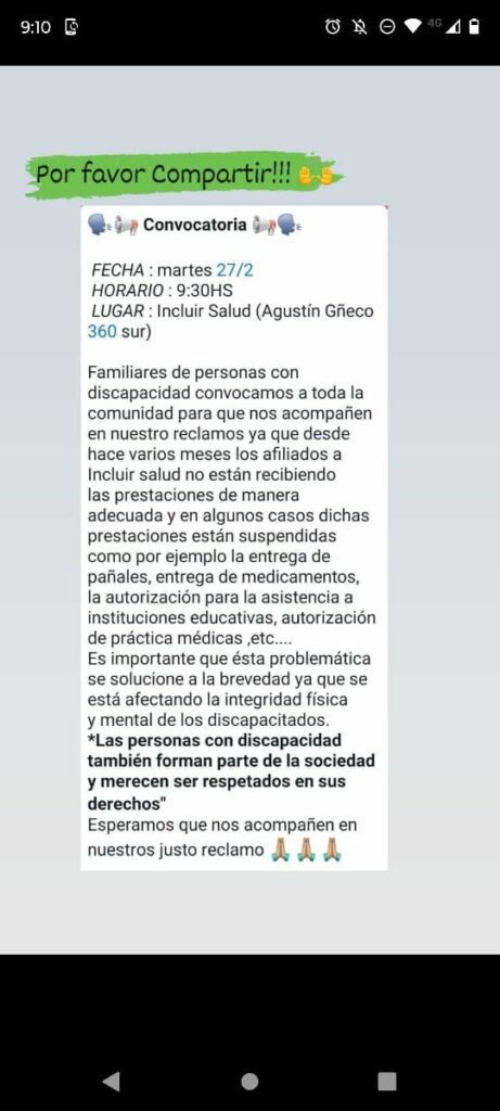 Incluir Salud es la prestación de servicio estatal para personas con discapacidad en Argentina, de la cual se realiza un descuento en el recibo de sus pensiones. Personas con discapacidad y familiares de las misma durante el fin de semana iniciaron una convocatoria para hacer un reclamo sobre el mál servicio de salud que están teniendo. Por esto mismo se manifestarán durante la mañana del martes.