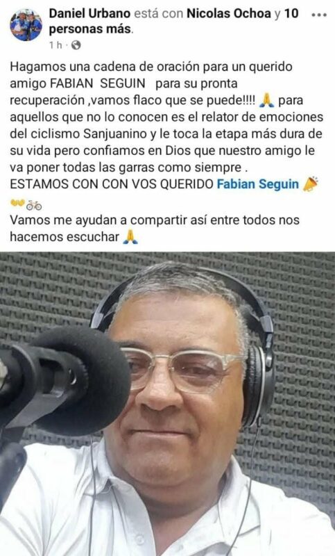 «Para aquellos que no lo conocen, es el relator de emociones del ciclismo sanjuanino y le toca la etapa más dura de su vida», escribió Daniel Urbano en su cuenta de Facebook donde expresó: «confiamos en Dios que nuestro amigo le va a poner todas las garras como siempre».