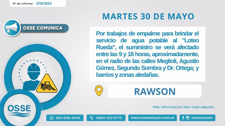 Personal del Departamento Obras de OSSE realizará, este martes 30 de mayo de 2023, la obra “Ampliación Red Distribuidora Loteo Rueda”. El objetivo es incorporar al sistema de red de agua potable a dicho loteo, ubicado calle Meglioli, entre República del Líbano y Dr. Ortega, en el departamento Rawson.