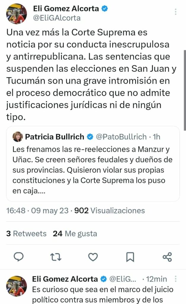 La decisión fue tomada, en ambos casos, con las firmas de los jueces Horacio Rosatti, Juan Carlos Maqueda y Carlos Rosenkrantz, ante la ausencia del cuarto y enemistado supremo Ricardo Lorenzetti. Las presentaciones judiciales fueron hechas por el intendente de San Miguel de Tucumán y candidato a vicegobernador de Juntos por el Cambio, Germán Alfaro; y por el empresario y candidato liberal a gobernador de San Juan, Sergio Vallejos; con objetivos similares: pedir la anulación de las fórmulas del oficialismo integradas por los actuales gobernadores de Tucumán, Juan Manzur; y de San Juan, Sergio Uñac.