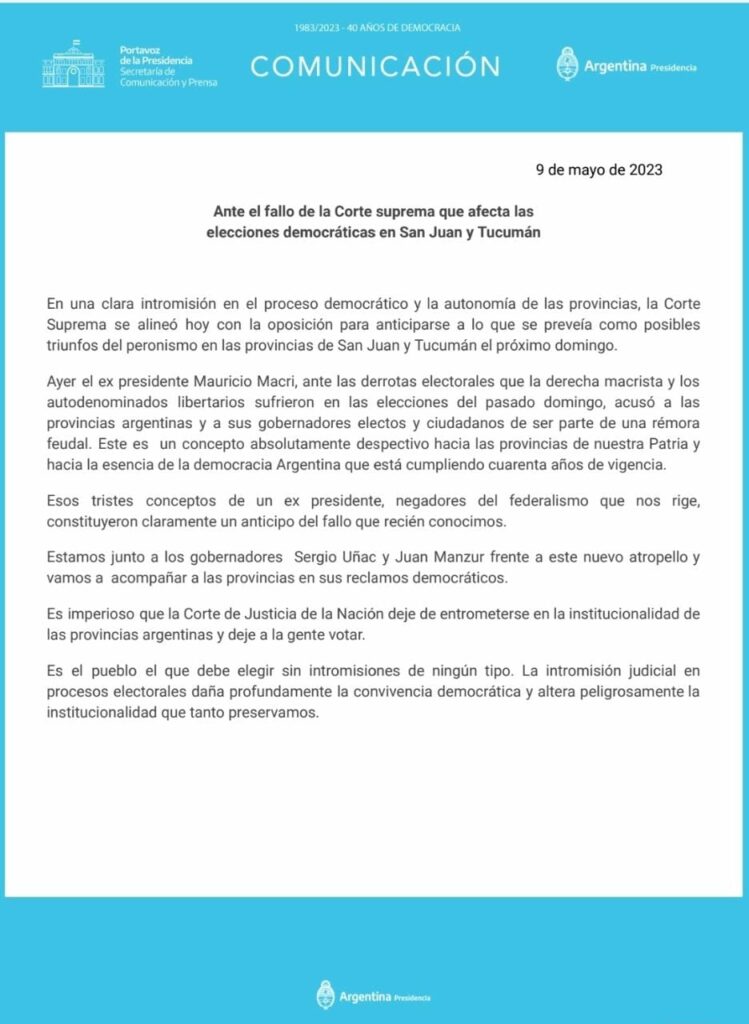 La Presidencia de la Nación Argentina emitió un comunicado refiriéndose a la decisión de la Corte Suprema de Justicia de la Nación con respecto a suspender las elecciones provinciales en nuestra provincia y en Tucumán. Además otros referentes nacionales del oficialismo se pronunciaron en sus redes sociales en contra de la desicion tomada.