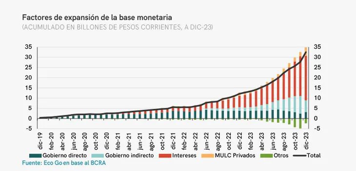 Según un informe de EcoGo, el BCRA se vio obligado a la emisión debido al pago de interés de sus pasivos remunerados, la compra de divisas, el rescate de las levid y la ejecución de los puts. Estas razones implicaron una expansión de pesos emitiendo más de $6 billones. Vale aclarar que el informe es de todo el mes de diciembre.