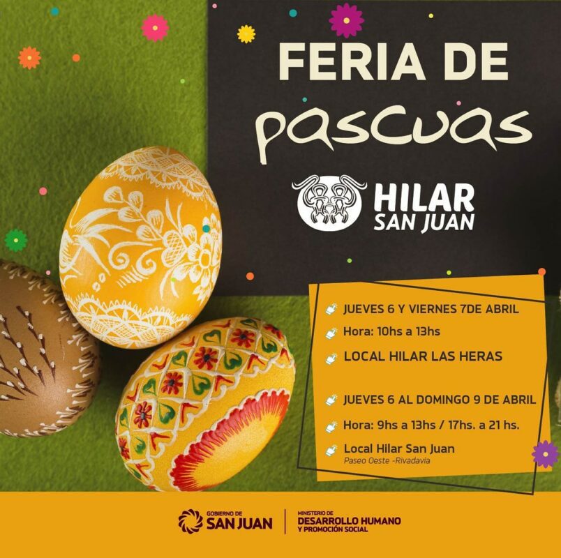 Por su parte, en el local emplazado en Paseo Oeste (Ignacio de la Roza entre Malvinas Argentinas y Rastreador Calivar, Rivadavia) la feria funcionará desde el jueves santo hasta el domingo de Pascua, en horario de 9 a 13 y de 17 a 21 horas.