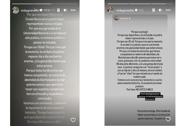 «Porque soy mujer», arranca el comunicado que publicó Granatto a través de un historia de Instagram, donde fundamentó con diferentes argumentos su llamado a votar a Massa y rechazar a Milei. “Porque soy deportista y sin el Estado nacional no podría haber representado nunca a mi país. Porque soy egresada de la Universidad nacional y, si no hubiese sido pública, no hubiese podido ni pensar en estudiar”, comienza la enumeración de la jugadora de las Leonas, medalla de plata en Tokio 2020.