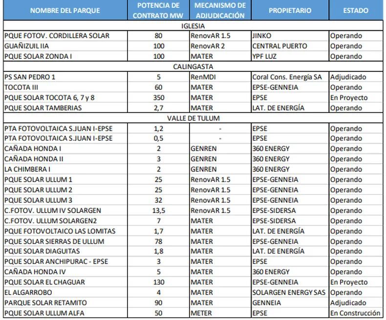 Actualmente el 35,6% de los parque solares en operación de la Argentina se encuentran en San Juan, y sumando todos los proyectos solares adjudicados a través del MiniRen y los proyectos presentados a través del MATER (Mercado a Término de Energías Renovables), San Juan se encuentra en el primer lugar del país en cantidad de proyectos, con más del 50%.