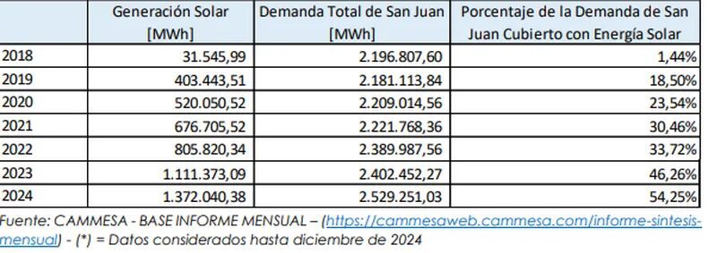 Un informe elaborado por la empresa estatal Energía Provincial Sociedad del Estado, con datos a diciembre de 2024; demuestra que la generación solar fotovoltaica en la provincia ha venido creciendo paulatinamente desde la primera planta solar instalada en Latinoamérica en operación desde abril de 2011, denominada San Juan I.