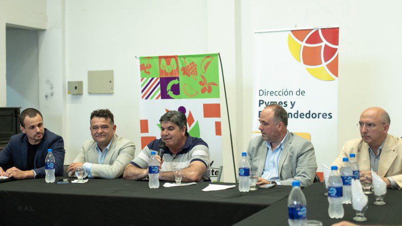 Participaron del conversatorio, el Secretario de Coordinación para el Desarrollo Económico, Alfredo Aciar, el Secretario de Industria, Comercio y Servicios, Alejandro Martín, el Secretario de Agricultura, Ganadería y Agroindustria, Miguel Moreno, el director de Pymes y Emprendedores, José Carpino, el intendente de Sarmiento, Alfredo Castro y productores de la zona.