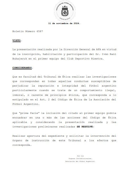Y sostiene que «‘prima facie’ la inclusión del citado (Iván Buhajeruk) al primer equipo podría encuadrar en una o más de las acciones del Código de Ética aplicable» por lo que se «resuelve» la «apertura del expediente y solicitar la intervención del órgano de instrucción de este Tribunal».
