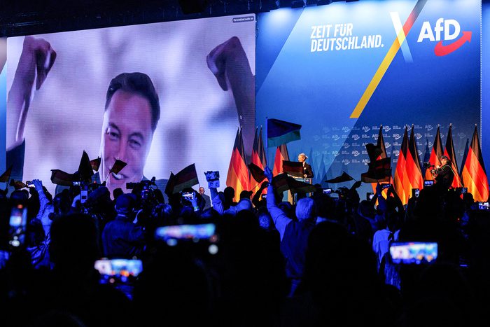 El 21 de diciembre Elon Musk declaró oficialmente en X su apoyo al partido de extrema derecha alemán y escribió: «Solo la AfD puede salvar a Alemania». A inicios de enero organizó un intercambio en su plataforma con la copresidenta de ese partido, Alice Weidel, para reiterar su apoyo. El sábado Weidel agradeció calurosamente al multimillonario: «Nosotros le deseamos a usted y al presidente Donald Trump y al vicepresidente JD Vance lo mejor para recobrar la grandeza de América».