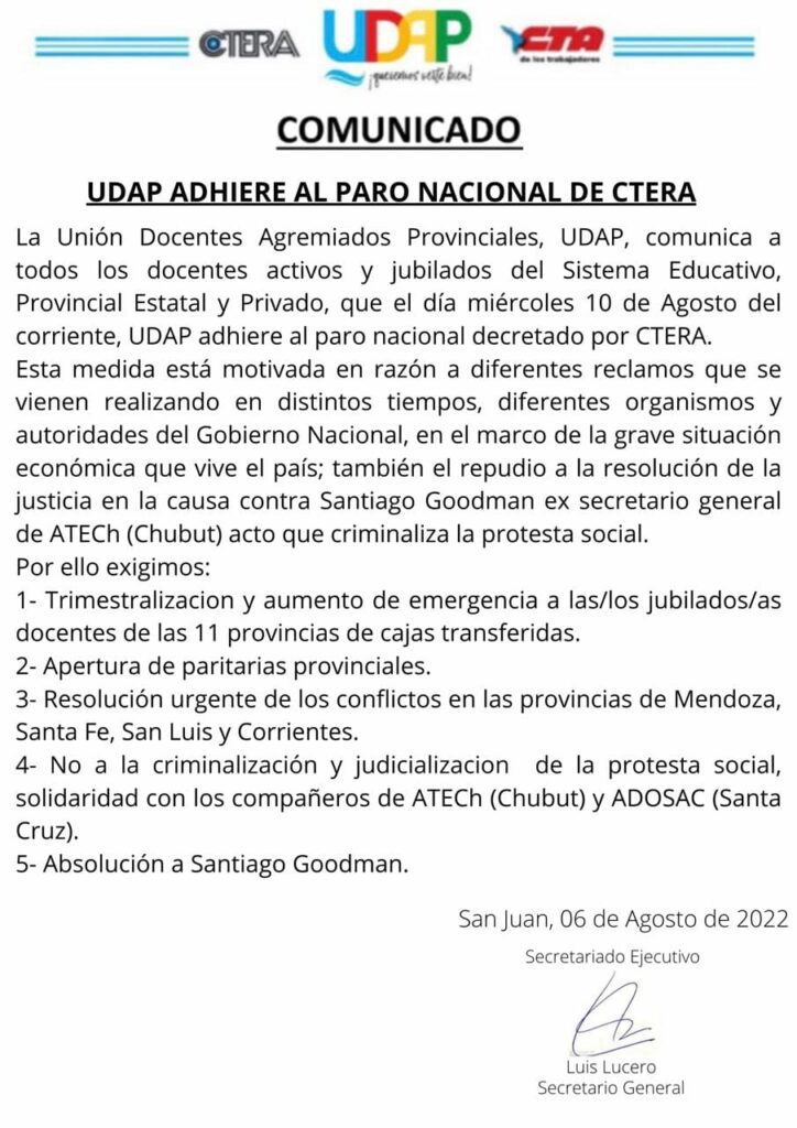 UDAP (Unión de Docentes Agremiados Provinciales) anunció un paro por 24 horas en San Juan. La medida fue convocada por CTERA (Confederación de Trabajadores de la República Argentina) a nivel nacional en reclamo de mejoras salariales y actualización de las jubilaciones.