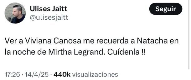 “Ver a Viviana Canosa me recuerda a Natacha en La noche de Mirtha. ¡Cuídenla!”, publicó en su cuenta de X (ex Twitter), evocando la recordada aparición televisiva de su hermana, cuando en 2018 denunció la existencia de redes pedófilas vinculadas al poder. La referencia de Ulises no fue solo emocional: también implicó un llamado de atención, considerando el trágico final que tuvo su hermana en 2019, en circunstancias que aún generan controversia.