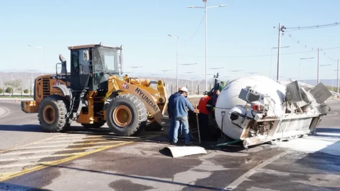 Un camión hormigonera, perdió su carga luego de volcar, en la mañana de hoy, en la rotonda ubicada en la intersección de avenida Salta y Costanera, frente al Predio Ferial de Chimbas.