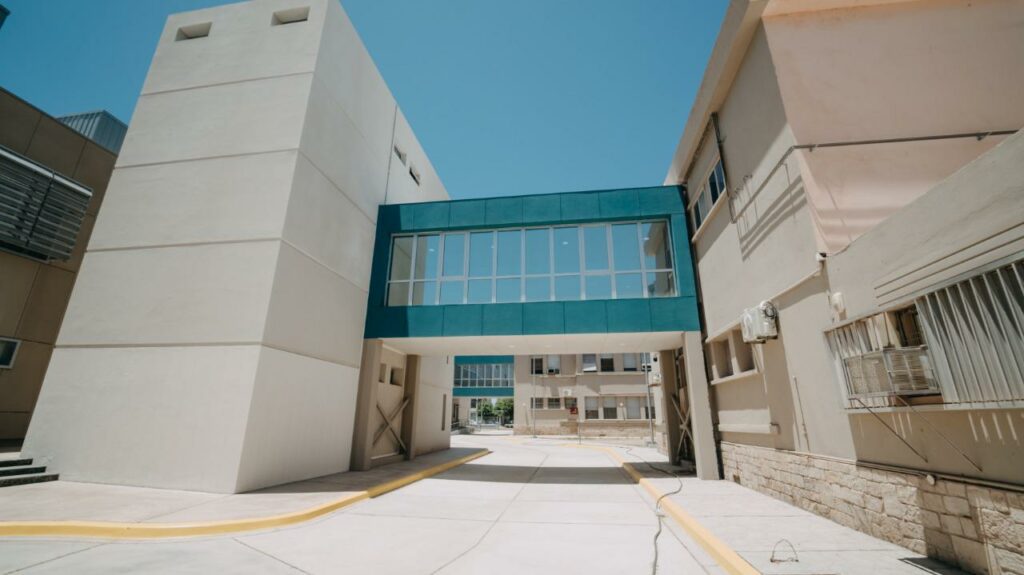 Además, la nueva ampliación se vincula al edificio existente a través de cuatro conectores: en planta baja con la circulación del ala norte, en planta alta con la circulación de internación de las alas norte y sur y, también en planta alta, el ala central con el área quirúrgica.